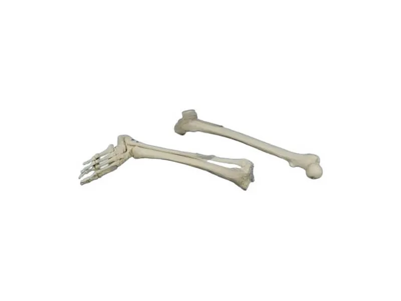 Модель скелета правой нижней конечности, выполненная в натуральную величину. Состоит из бедренной, большеберцовой и малоберцовой костей, надколенника и костей стопы (кости предплюсны, кости плюсны, фаланги пальцев). Кости стопы подвижны, соединены между собой проволокой.