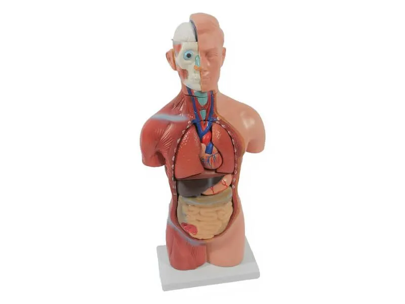 Разборная модель торса человека с реалистичным изображением анатомических структур. Выполнена в уменьшенном масштабе (высота 42 см), состоит из 18 частей.