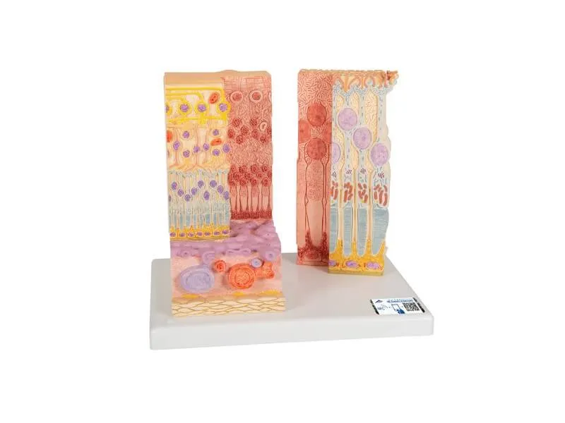 - Правая часть модели — увеличенный срез, показывает микроскопическую структуру фоторецепторов и клеток пигментного слоя