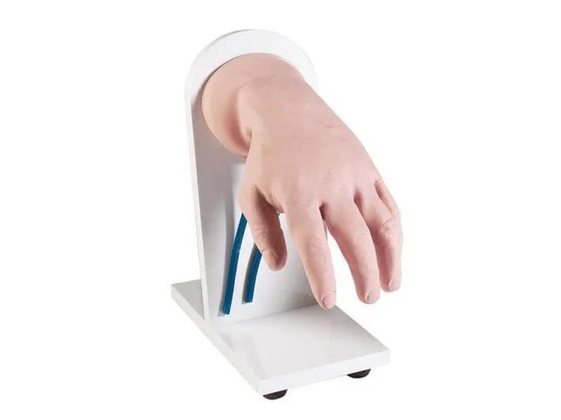 Верхняя поверхность тренажера инъекций максимально естественной модели кисти включает вены запястья, пальцев и большого пальца руки, куда можно вводить инъекции.