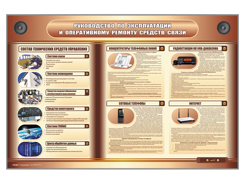 Электрифицированный стенд "Руководство по эксплуатации и оперативному ремонту средств связи" представляет собой панель с раздельной секционной световой индикацией, на котором представленаинформация об основных ремонтных действия средств связи, с голосовым сопровождением, который поэтапно рассказывает о предназначении каждогопредмета и его ремонте.