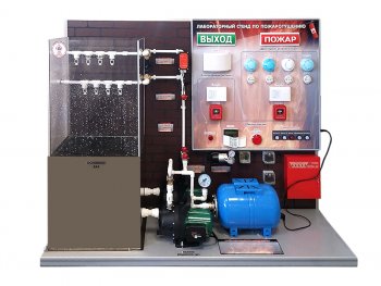Конструктивно стенд состоит из металлического каркаса, столешницы с размещенными на ней гидропневмобаком, основным баком и двумя насосами, щита из влагостойкого МДФ, на котором расположены функциональные элементы пожарного трубопровода, воздушный компрессор, электронное оборудование насосной станции и металлопластиковая панель с приборами автоматической пожарной сигнализации. Благодаря использованию реально действующих приборов и аппаратов стенд обеспечивает подлинность всех режимов работы автоматических систем водяного пожаротушения с минимальной имитацией (имитируется только термическое вскрытие спринклера).