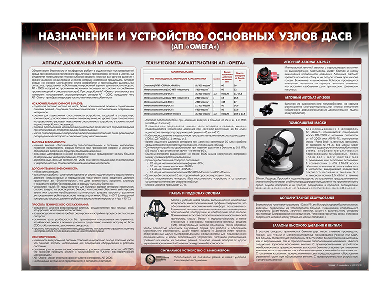 Стенд «Назначение и устройство основных узлов ДАСВ» (АП «Омега») представляет собой учебно-наглядное пособие, предназначенное для изучения конструктивных особенностей дыхательного аппарата со сжатым воздухом данной модели. На стенде в доступной и систематизированной форме показаны основные элементы аппарата, их расположение, назначение и взаимодействие при эксплуатации в условиях задымления и наличия токсичных веществ.